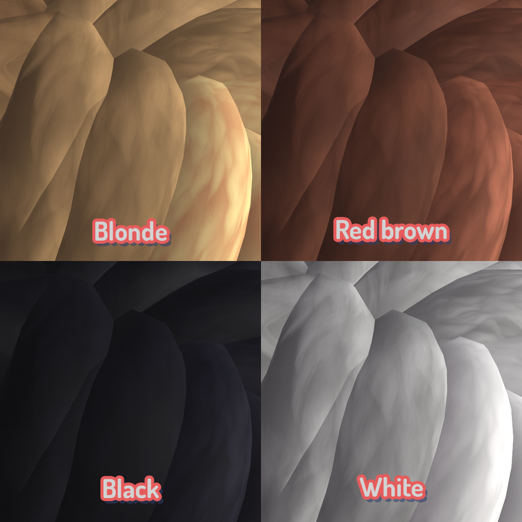 Like with the RoverCat's ears and tails, these hair assets use VRCFury to be quickly swapped on and off of any avatar by just dragging them in and out of the heirarchy. No need to mess around with armatures, just drag, drop and go!